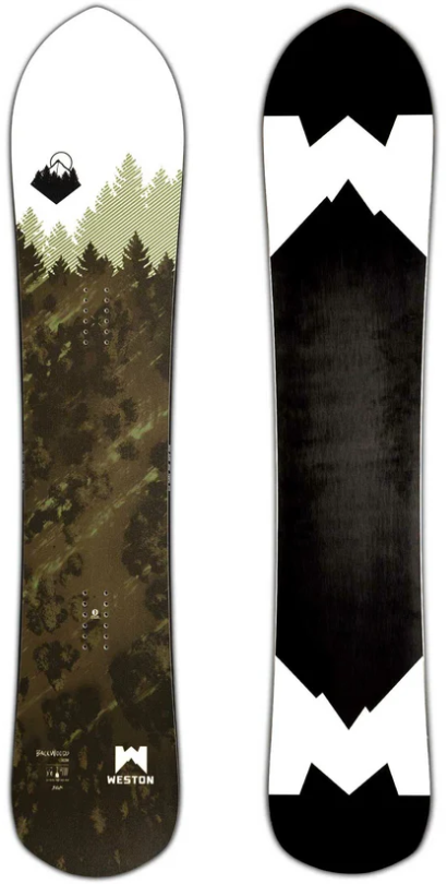 The Weston Backwoods is a powder & freeride hybrid that prefers trees, powder, and steeps. Like most powder boards, the Backwoods has a very wide nose and a tapered tail, but it differentiates itself with a mid-stiff flex, Weston's Freeride camber-dominant profile, and only 10mm of setback. This combination keeps the board nimble in trees, reliable on crud, and floaty in deep snow. A powerful core of poplar and bamboo stringers helps keep this board smooth and surfy while tip-to-tail carbon stringers give it a little extra pop. The castor bean-based, Rugged Nylon top sheet, helps shed snow and adds durability while the Sintered 4001 base provides top-of-the-line speed in a minimalist black design to create seamless repairs. All of this helps the Backwoods to slay pow while still performing in variable conditions as you hop from pow stash to pow stash.